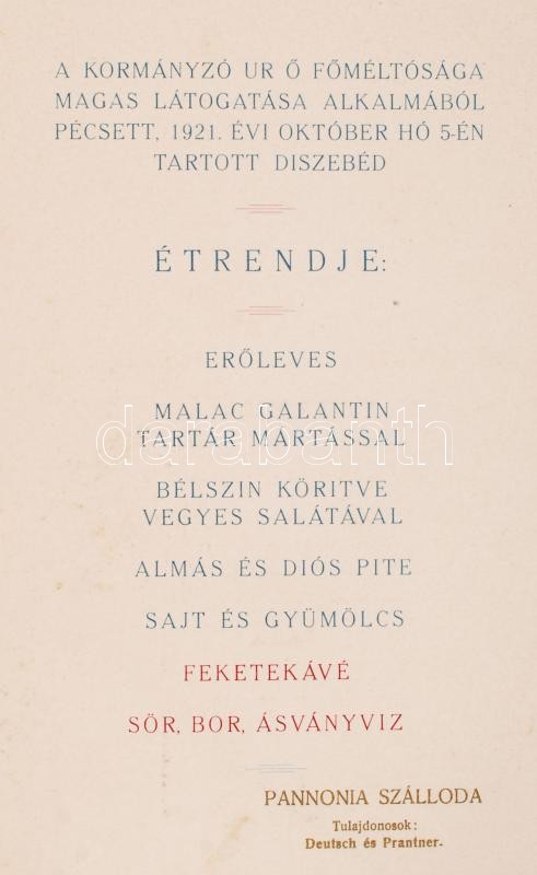 1921 Pécs Pannónia szálloda: A kormányzó látogatása alkalmából tartott... https://www.darabanth.com/de/264-Fernauktion/264.0/Andere-Sammelgebiete/Historische-Dokumenten-Handschriften~16/1921-Pecs-Pannonia-szalloda-A-kormanyzo-latogatasa-alkalmabol-tartott-diszebed-menukar~II1315179