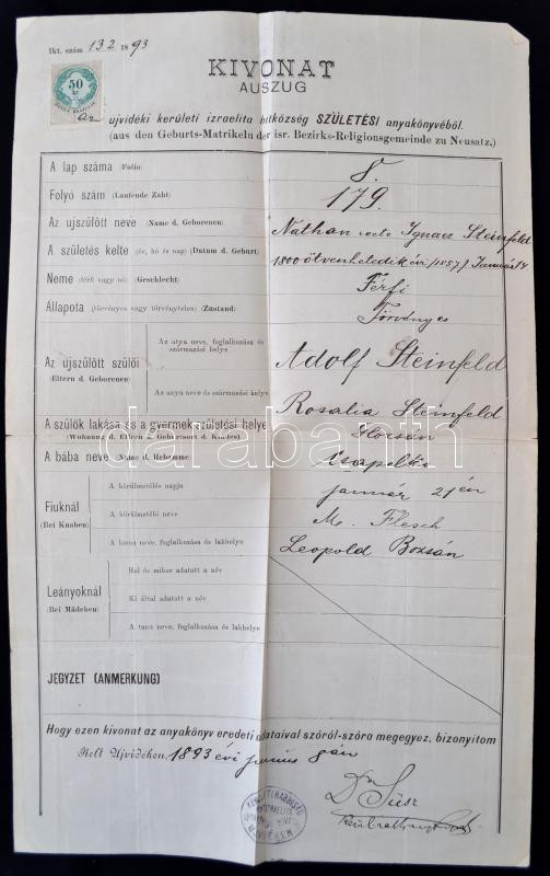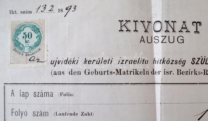 Beschreibung: 1893 Kivonat az ujvidéki kerületi izraelita hitközség születési anyakönyvéből, okmánybélyeggel (50kr.), 42x26cm