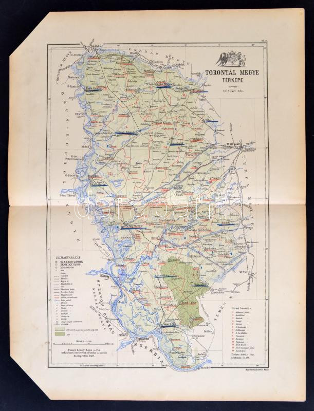 Torontál megye térképe, Gönczy Pál - Kogutowicz Manó: Magyarország megyéinek kézi atlasza. Tervezte: - -, rajzolta: - - Bp. (1890.) Posner Károly Lajos és fia. Sarok levágva, 56x45cm