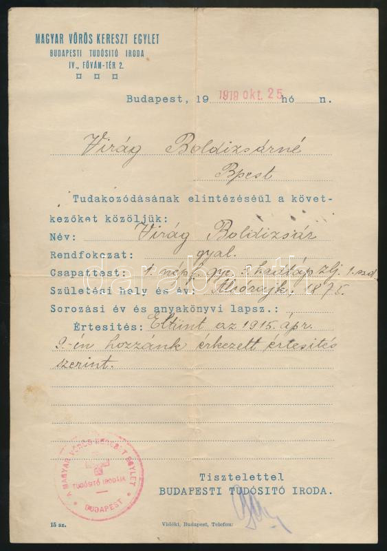Beschreibung: Nagyar Vöröskereszt Egylet hivatalos válasza keresett személy ügyében, 20x14cm