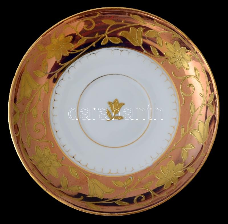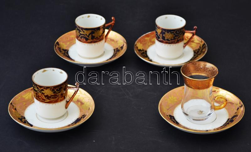 Beschreibung: Virágmintás aranyozott porcelán csészék(3 db), 1 db üveg csésze, 4 db porcelán csészealj, kopásnyomokkal, egy jelzett