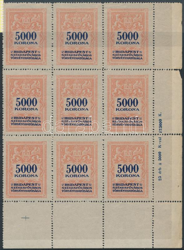 Budapest Székesfőváros 5000K ívsarki kilences tömb https://www.darabanth.com/de/264-Fernauktion/264.0/Andere-Sammelgebiete/Stempelmarken~14/Budapest-Szekesfovaros-5000K-ivsarki-kilences-tomb~II1314934
