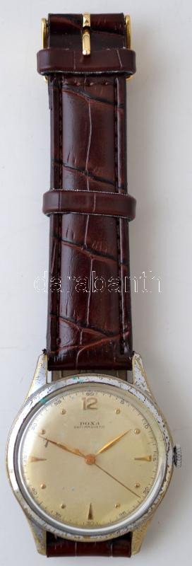 Beschreibung: Doxa antimagnetic, másodpercmutatós svájci karóra hibátlan számlappal, működő állapotban, új bőr szíjjal.
