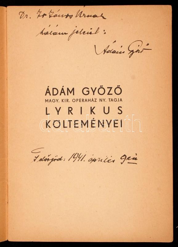 Beschreibung: Ádám Győző lyrikus költeményei. Bp., é.n., Sárközi testvérek. 32 p. Kiadói papírkötésben. Dedikált példány!