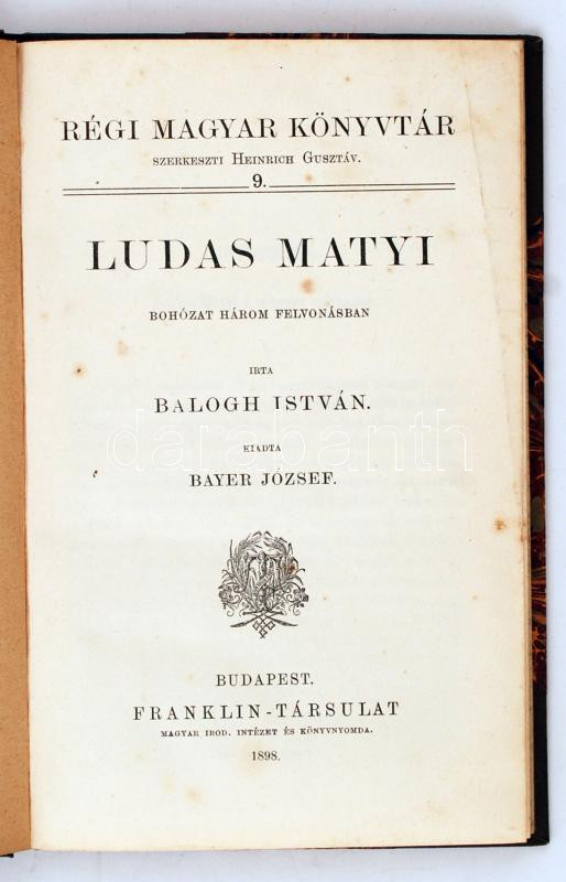 Balogh István: Ludas Matyi. Bohózat három felvonásban. Bp., 1898, Fran... https://www.darabanth.com/de/264-Fernauktion/264.0/Bucher/Bucher-Sonstige-Raritaten~40/Balogh-Istvan-Ludas-Matyi-Bohozat-harom-felvonasban-Bp-1898-Franklin-Korabeli-felvaszon~II1319851