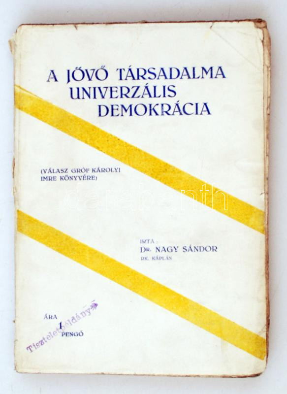 Dr. Nagy Sándor: A jövő társadalma univerzális demokrácia. Válasz Gróf Károlyi Imre könyvére. Kunszentmárton, 1931. Wolff Desző könyvnyomdája. Kiadói papírkötésben