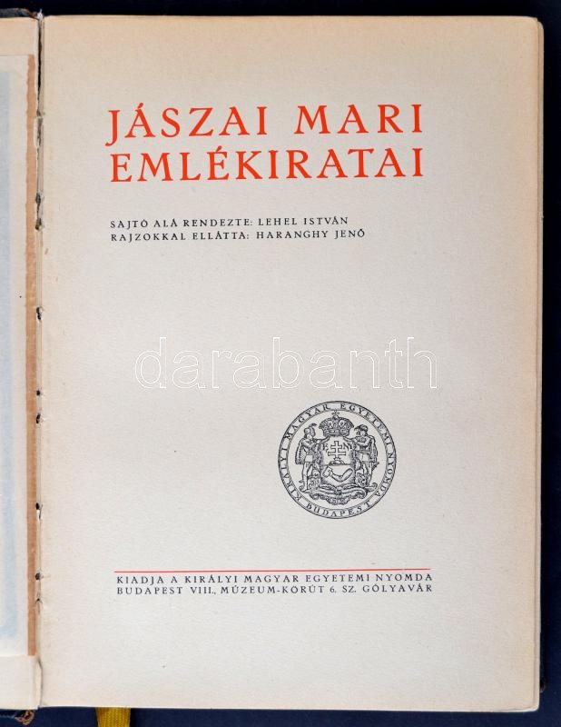 Jászai Mari emlékiratai. s. a. r.: Lehel István, illusztrálta Haranghy Jenő. Bp., 1927, Királyi Magyar Egyetemi Nyomda. Kiaaé laza, aranyozott kiadói bőrközésben, a gerince kopottas.