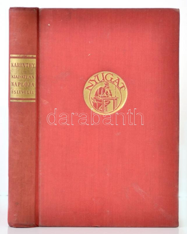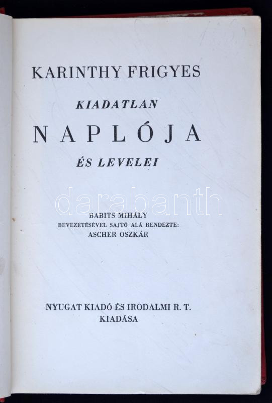 Karinthy Frigyes kiadatlan naplója és levelei. Babits Mihály bevezetésével sajtó alá rendezte Ascher Oszkár Bp., 1938, Nyugat. 201 p., 12 t. Kiadói, kissé kopottas, aranyozott egész-vászonkötésben.