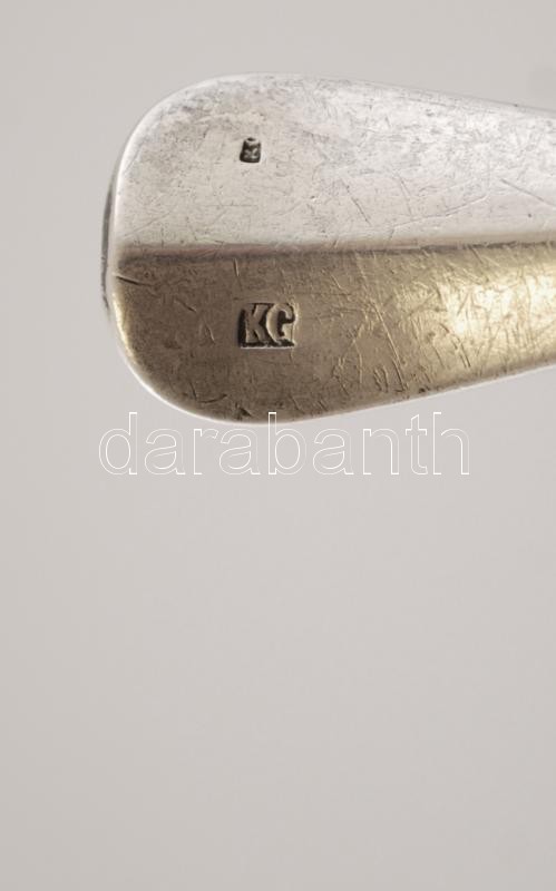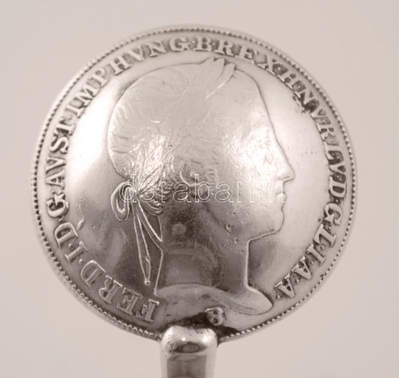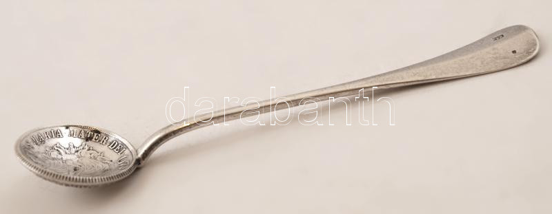 Ezüst 1848-as Szűz Máriás érmés fűszerkanál, Ag., nettó: 15,1gr., jelzett, 10cm /Silver 1848 coins spices spoon, net, Ag..15.1 gr, marked, 10cm