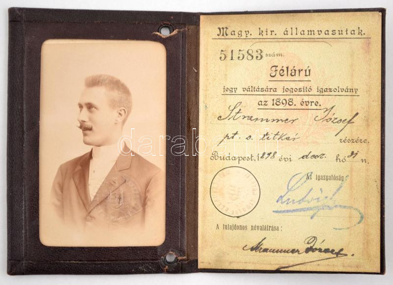 1898 Félárú jegyváltásra jogosító fényképes MÁV-igazolvány, arcképes, ... https://www.darabanth.com/de/265-Fernauktion/265.0/Andere-Sammelgebiete/Dokument~16/1898-Felaru-jegyvaltasra-jogosito-fenykepes-MAV-igazolvany-arckepes-szep-allapotban-~II1329388