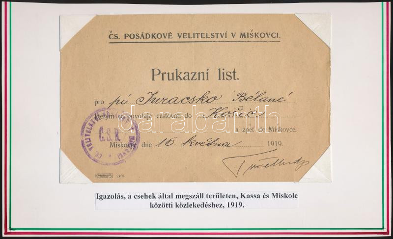 1919 Cseh igazolás a megszállt területeken Kassa és Miskolc közötti kö... https://www.darabanth.com/de/265-Fernauktion/265.0/Andere-Sammelgebiete/Dokument~16/1919-Cseh-igazolas-a-megszallt-teruleteken-Kassa-es-Miskolc-kozotti-kozlekedesre-jogosito~II1319180