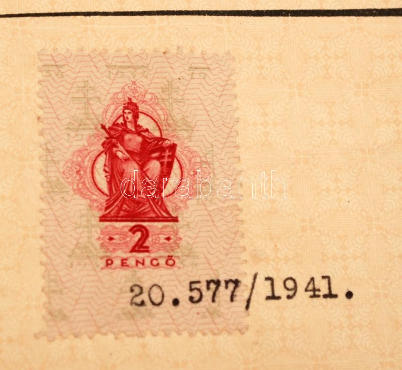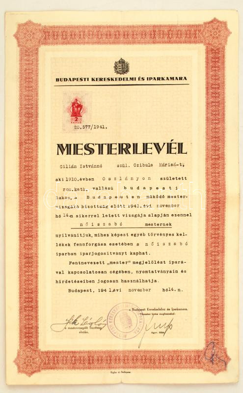 Beschreibung: 1941 Bp., A Budapesti Kereskedelmi és Iparkamara által női szabó részére kiállított mesterlevél, okmánmybélyeggel