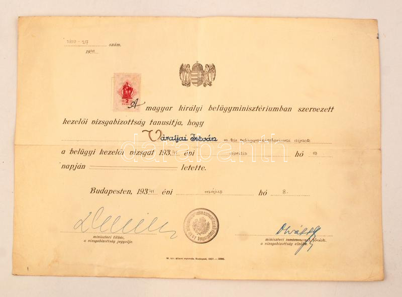 1941 M. kir. belügyminiszteri díjnok belügyi kezelői vizsgát tett, ok... https://www.darabanth.com/de/265-Fernauktion/265.0/Andere-Sammelgebiete/Dokument~16/1941-M-kir-belugyminiszteri-dijnok-belugyi-kezeloi-vizsgat-tett-oklevel-okmanybelyeggel-~II1324036