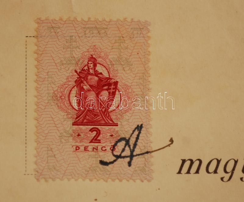 Beschreibung: 1941 M. kir. belügyminiszteri díjnok belügyi kezelői vizsgát tett, oklevél okmánybélyeggel (2 pengő), 25x35cm