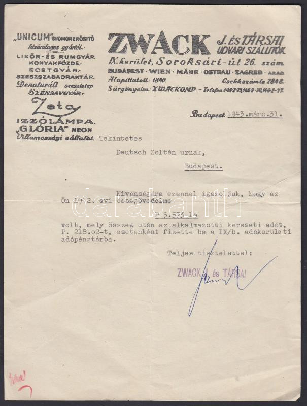 Beschreibung: 1943 Bp., A Zwack J. és Társai Udvari Szállítók fejléces levélpapírjára kiállított jövedelemigazolás