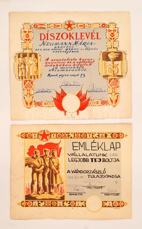 Beschreibung: 1951-1952 2 db szocreál grafikás emléklap vállalati tejbolt részére