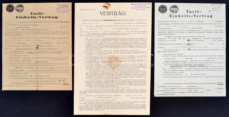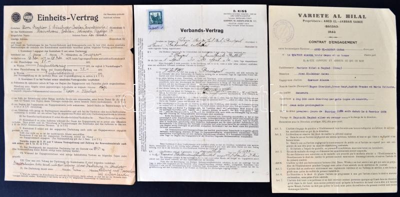 Beschreibung: cca 1930 Alaska és Erna táncosok 8 db magyar és külföldi szerződése különböző mulatókba, varieté műsorokba