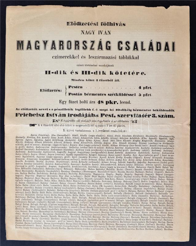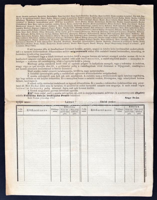 Beschreibung: 1857 Pest, Előfizetési felhívás Nagy Iván Magyarország családai címerekkel és leszármazási táblákkal című történelmi munkájának II. és III. kötetére