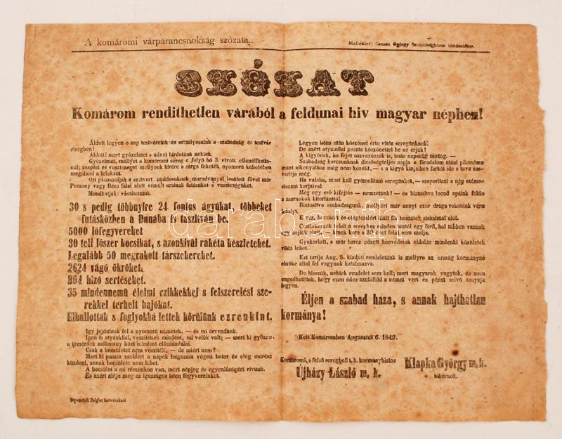 1895 Szózat Komárom rendíthetetlen várából a feldunai hiv magyar néphe... https://www.darabanth.com/de/265-Fernauktion/265.0/Andere-Sammelgebiete/Drucksachen~200295/1895-Szozat-Komarom-rendithetetlen-varabol-a-feldunai-hiv-magyar-nephez-Melleklet-Gracza-G~II1328747