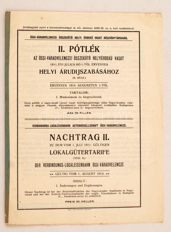Beschreibung: 1914 Az Őssi-Váradvelenczei összekötő helyi érdekű vasút részvénytársaság, II. pótlék helyi árudíjszabáshoz, pp.:6, 26x20cm