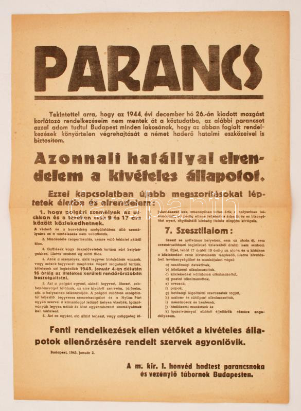 1945 Parancs, Azonnali hatállyal elrendelem a kivételes állapotot. A m. kir. I. honvéd hadtest parancsnoka és vezénylő tábornok Budapesten, plakát, 40x29cm