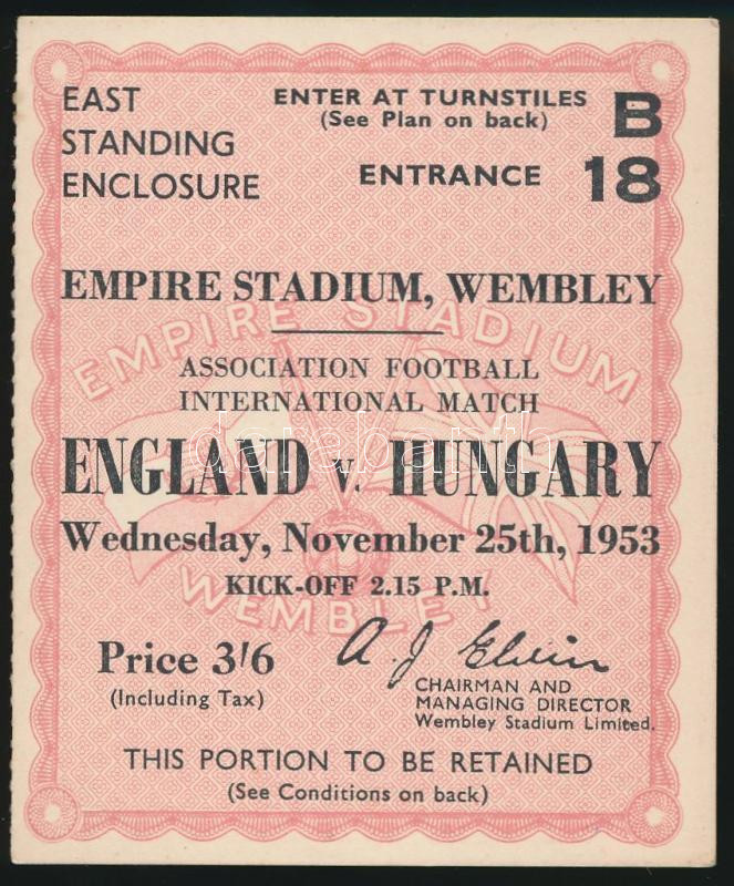 1953 Az évszázad mérkőzésnek belépőjegye, England vs Hungary. Wednesday November 25th 1953. Empire Stadium Wembley. Szép állapotban, 8x7cm /1953 Entrance ticket of the the match is centuries, England vs Hungary. Wednesday November 25th 1953. Empire Stadium Wembley, in fine condition