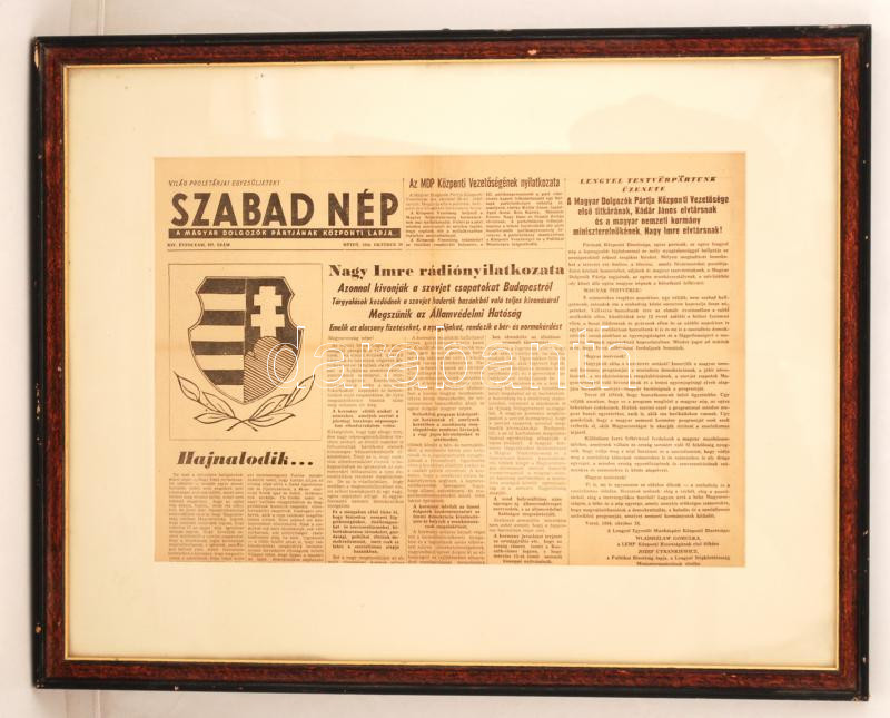 1956 Október 29. Szabad Nép címlapja üvegezett keretben, 27×40 cm https://www.darabanth.com/de/265-Fernauktion/265.0/Andere-Sammelgebiete/Drucksachen~200295/1956-Oktober-29-Szabad-Nep-cimlapja-uvegezett-keretben-27C39740-cm~II1285323
