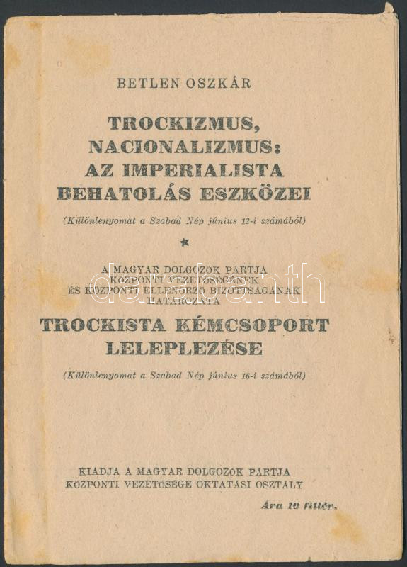 Bethlen Oszkár: Trockizmus, Nacionalizmus: Az imperialista behatolás e... https://www.darabanth.com/de/265-Fernauktion/265.0/Andere-Sammelgebiete/Drucksachen~200295/Bethlen-Oszkar-Trockizmus-Nacionalizmus-Az-imperialista-behatolas-eszkozei-Koncepcios-perekh~II1324077