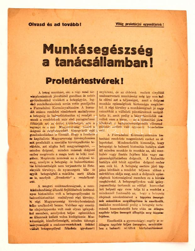 Beschreibung: cca 1919 Munkásegészség a tanácsállamban! Világ proletárjai egyesüljetek! röplap, 27x21cm