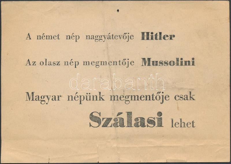 cca 1943 Szálasit éltető hungarista röplap. 15x11 cm https://www.darabanth.com/de/265-Fernauktion/265.0/Andere-Sammelgebiete/Drucksachen~200295/cca-1943-Szalasit-elteto-hungarista-roplap-15x11-cm~II1323931