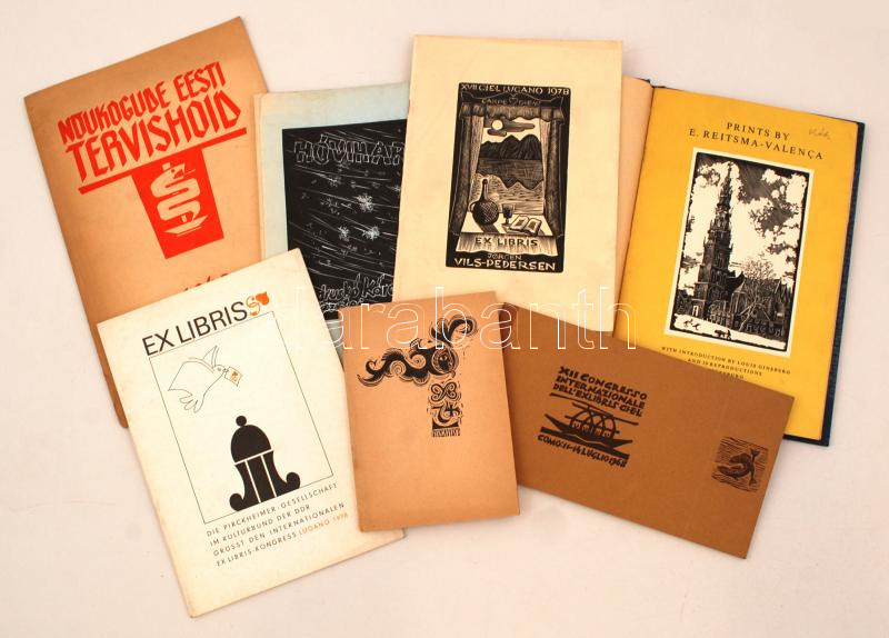 7 db különféle, többnyelvű ex librisekkel, grafikákkal kapcsolatos érdekes nyomtatvány, katalógus, így benne: Ekslibris Wroclawski 1974, Prints by E. Reitsma-Valenca, Andruskó Károly metszetei, stb. / 7 volumes of various, multi-lingual journals, catalogues, on the topic of bookplates and other printmaking studies, such as: works of Károly Andruskó, Ekslibris Wroclawski 1974, Prints by E. Reitsma-Valenca, etc.