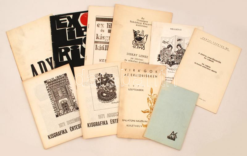 9 db különféle magyar nyelvű ex librisekkel, grafikákkal kapcsolatos érdekes nyomtatvány, katalógus, így benne: Andruskó Károly fametszetei, Virágok az ex libriseken, Kisgrafikai értesítő, stb.