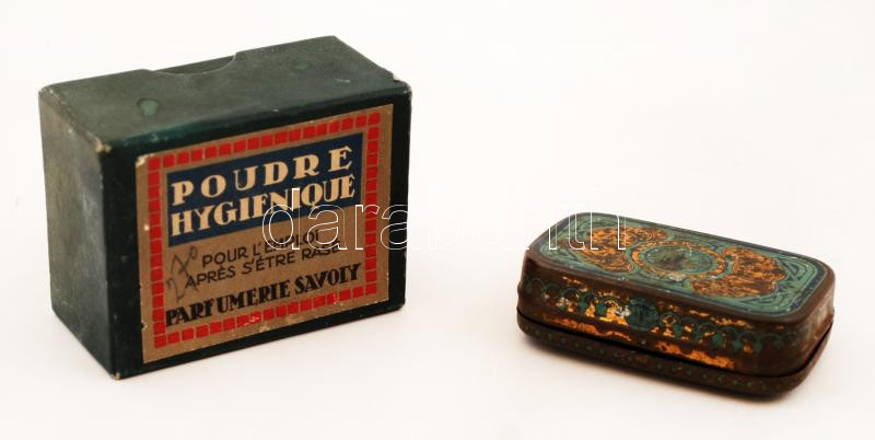 Beschreibung: Gonosan fém doboz és Poudre Hygienique papír doboz tartalommal