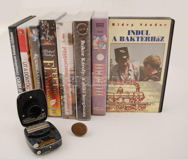 Beschreibung: Vegyes bolha tétel: német fénymérő, régi réz pecsétnyomó, 3 db üvegtárgy, műsoros VHS kazetták ill. DVD-k, köztük erotikus is