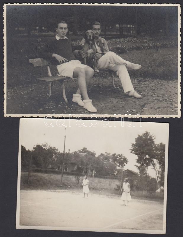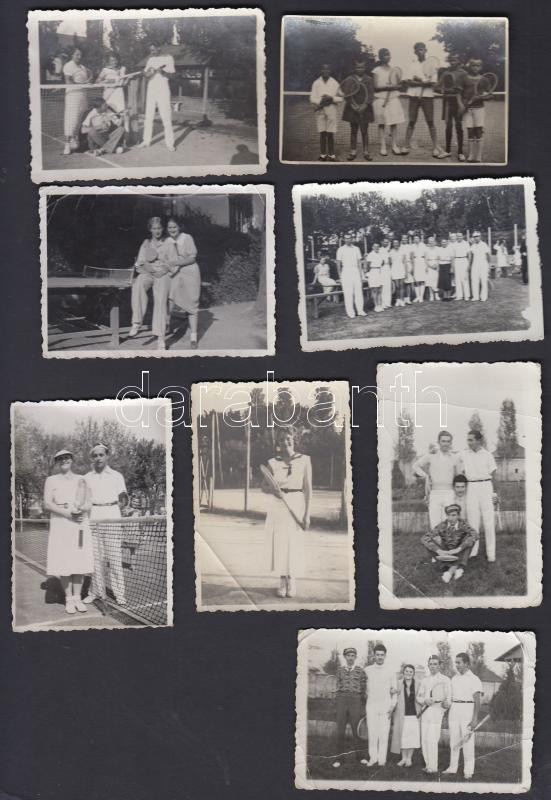 Beschreibung: cca 1927-1938 10 db teniszezőkről készült fotó, közte a Kisnyíri Tenisz Egyletről, 5x8 és 9x13 cm közötti méretekben