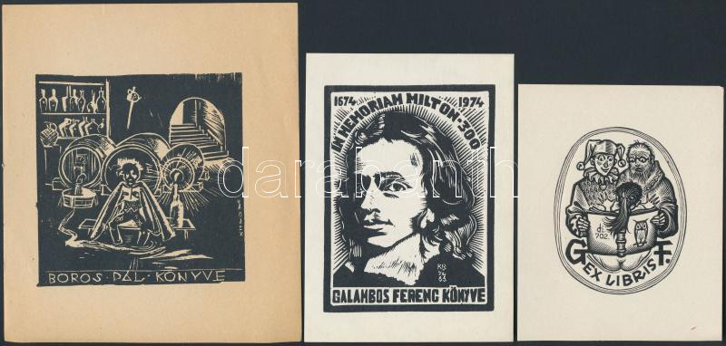 Beschreibung: 3 db ex libris klisék és fametszetek: Vadász, Drahos, K.B, 8×6-8×8 cm