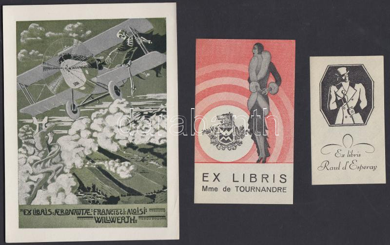 Beschreibung: 3 db külföldi ex libris, egyik jelzett a nyomaton, klisé papír, 8×4-11×15 cm