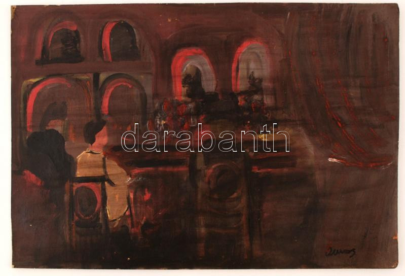 Beschreibung: Ámos jelzéssel: Előadás. Olaj, karton, 32×47 cm