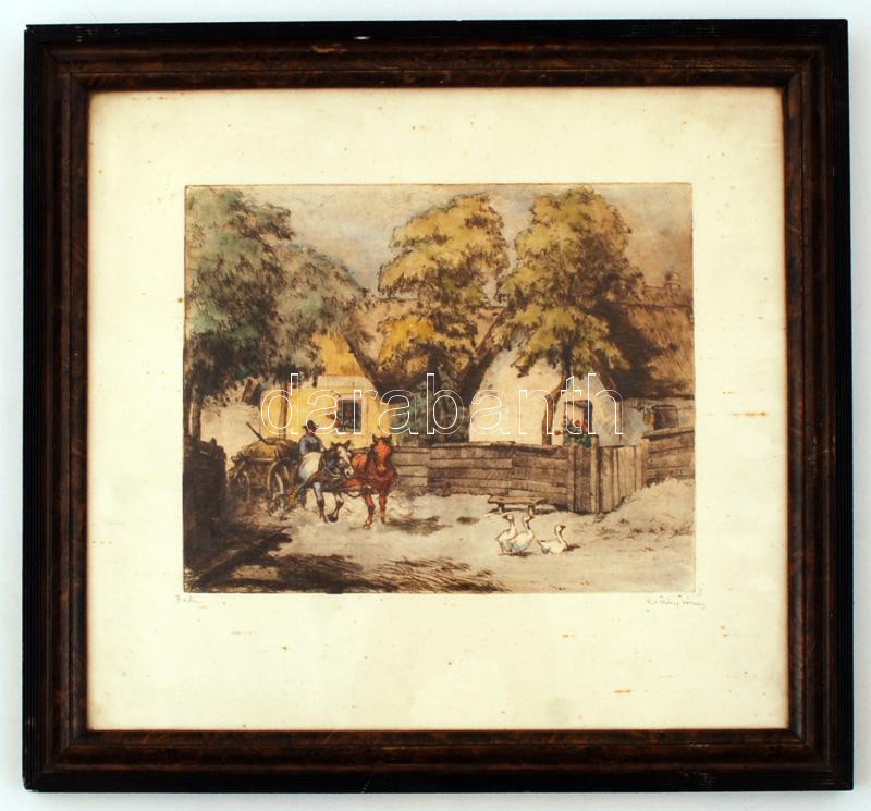Beschreibung: Csillag József (1894-1977): Falu. Színezett rézkarc, papír, jelzett, üvegezett keretben, foltos, 22×28 cm