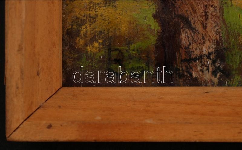 Beschreibung: Olvashatatlan jelzéssel: Piros tetős ház. Olaj, karton, keretben, 15×29 cm