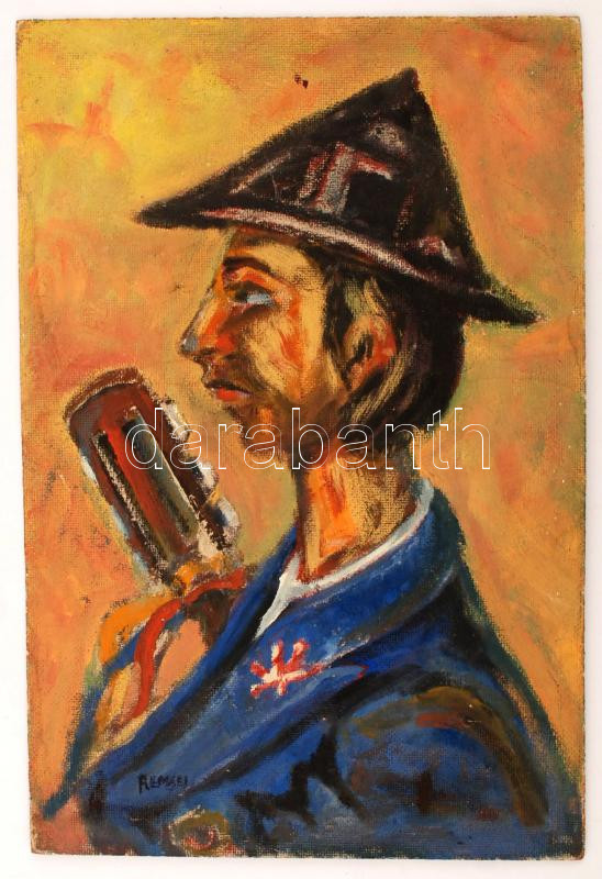 Beschreibung: Remsei jelzéssel: Kalapos férfi. Olaj, farost,