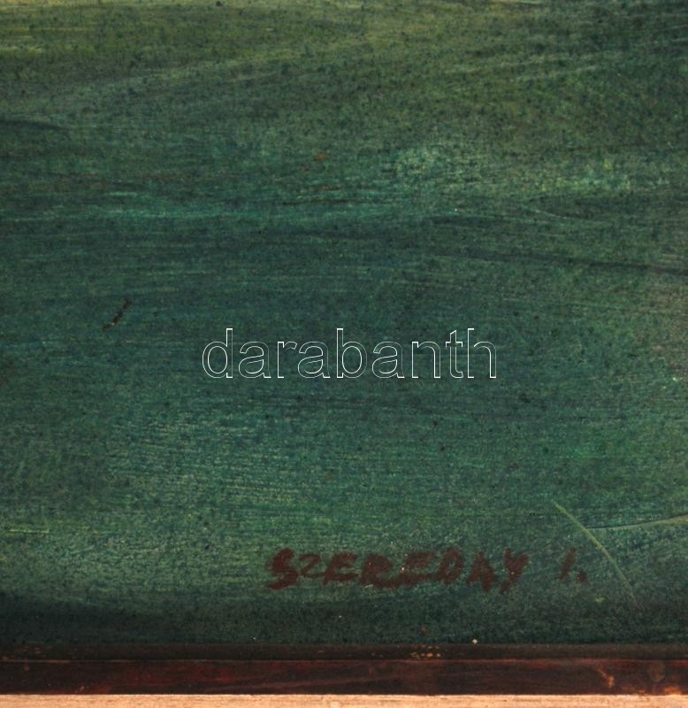 Beschreibung: Szereday Ilona (1952-): Vízpart. Olaj, farost, jelzett, keretben, 37×50 cm