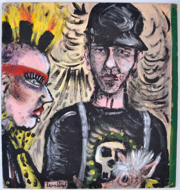 Beschreibung: Zemplényi jelzéssel: Retro fiatalság. Vegyes technika, furnérlemez, 60×56 cm