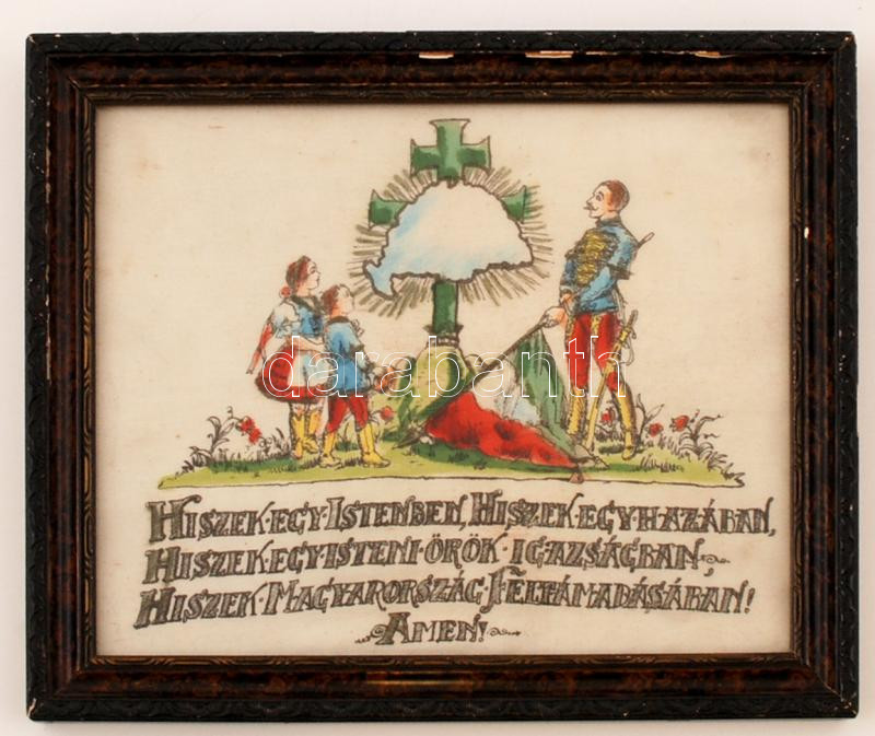 Beschreibung: cca 1925 "Hiszek egy Istenben..." Irredenta feliratú szövet kép, üvegezett keretben, 19x24 cm