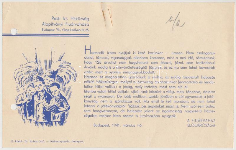 Beschreibung: 1941 Adományt kérő nyomtatvány, Pesti Izr. Hitközség alapítványi Fiuárvaháza, lyukasztva, 13x21cm