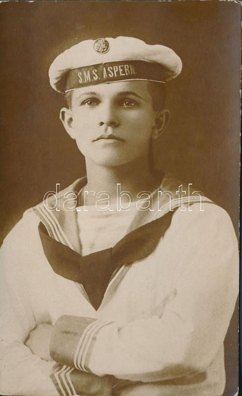 1918 Vogenberger Emil matróz portréja fotólapon, hátoldalon autográf üdvözlő sorai. Vogenberger az SMS Aspern legénységének tagjaként megjárta az I. világháborút, majd üdvözlőlap datálása után egy hónappal később öngyilkos lett. A zombori Rókustemetőben helyezték végző nyugalmra.