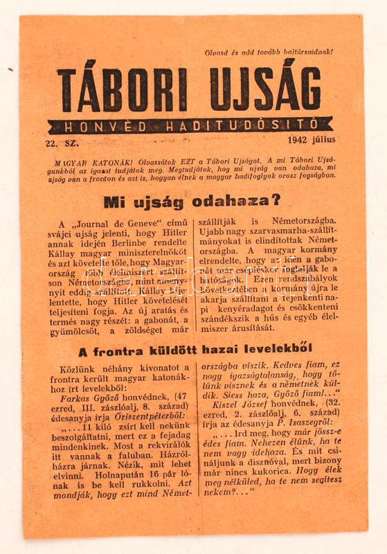 1942 Tábori Ujság, Honvéd Haditudósító, magyar nyelvű szovjet háborús... https://www.darabanth.com/de/265-Fernauktion/265.0/Andere-Sammelgebiete/Militaria~25/1942-Tabori-Ujsag-Honved-Haditudosito--magyar-nyelvu-szovjet-haborus-roplap-20x13cm~II1329064