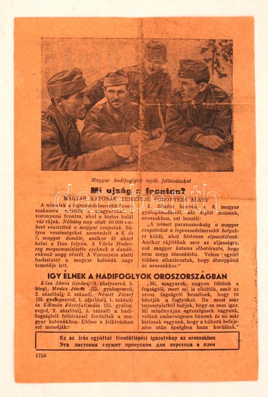 Beschreibung: 1942 Tábori Ujság, Honvéd Haditudósító, magyar nyelvű szovjet háborús röplap, 20x13cm