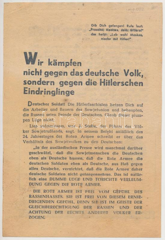 Beschreibung: cca 1943 Wir kampfen nicht gegen das deutsche Volk, sondern gegen die Hitlerischen Eindringlige, szovjet röplap, 20x13cm