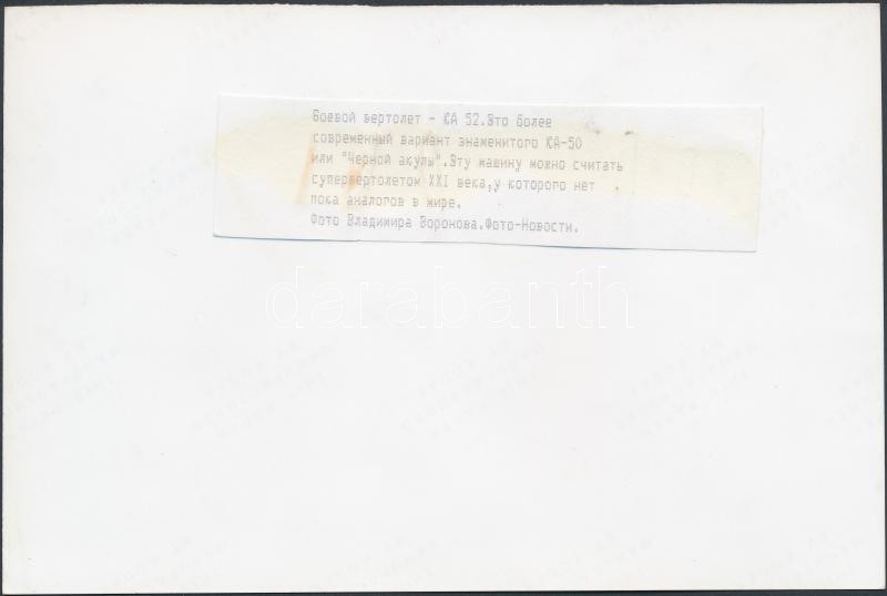 Beschreibung: cca 2000 Kamov Ka-52 "Aligátor", orosz gyártmányú kétüléses harci helikopter a szerelőhangárban. Orosz nyelven feliratozott fotó. 18x12 cm.